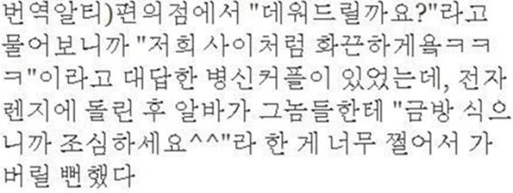 공개된 ‘알바생의 돌직구’ 게시물에는 한 편의점 알바생은 한 커플에게 “데워드릴까요?”라고 물었다.