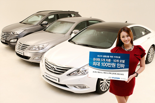 쏘나타, 제네시스, 싼타페 등의 10개 모델이 대상이다. 사양을 줄이지 않고 가격만 최고 100만원 내렸다.