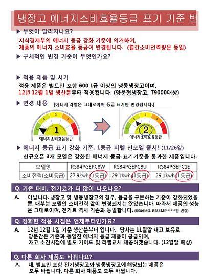 광고내용과 실 구입제품의 등급이 다른 것에 대해 소비자가 의혹을 제기했지만 확인 결과 국가 정책에 따라 에너지 소비효율등급 기준이 변경된 것으로 실제 전력소비량과 전기요금에는 변함이 없었다.