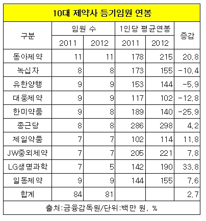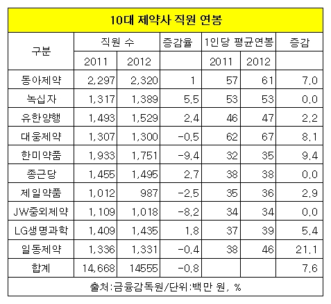 가장 높은 연봉인상률을 보인 곳은 일동제약으로 2011년 3천800만원에서 21.1% 오른 4천600만원을 기록했다. 일동제약은 직원 수도 5명만 줄어들어 인력 감축도 거의 없었던 것으로 나타났다.
