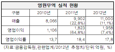 이에 따라 영원무역은 지난해 매출 1조1천억원, 영업이익 1천958억원의 실적을 거둘 것으로 추산된다. 이는 2011년에 비해 매출은 11.1%, 영업이익은 7.4% 증가한 수치다.