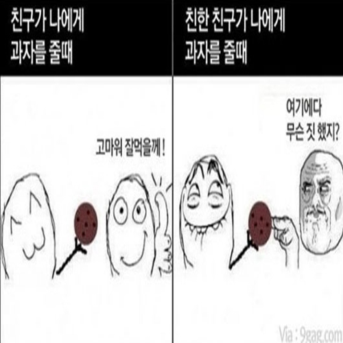 공개된 게시물에는 '친구가 나에게 과자를 줄 때'와 '친한 친구가 나에게 과자를 줄 때'를 구분해 설명하고 있는데, 일반 친구가 과자를 줄 때는 별다른 의심없이 "고마워 잘 먹을게"라고 답하지만 친한 친구가 과자를 줄 때는 의심스러운 표정으로 "여기에다 무슨 짓 했지?"라고 대응해 웃음을 자아낸다.