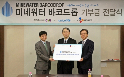 CJ제일제당과 BGF리테일은 바코드를 통한 기부 캠페인인 ‘미네워터 바코드롭 캠페인’을 통해 모은 기부금 1억3천여 만원을 유니세프에 전달했다고 7일 밝혔다.