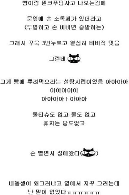 게시물 글에는 "빵집에 가서 빵이랑 밀크푸딩 사고 나오는 김에 문옆에 손 소독제가 있어서 3번이나 꾸욱 누르고 열심히 비볐다"며 "그런데 그건 손 소독제가 아니라 빵에 뿌려먹는 설탕시럽이었다"고 전했다.