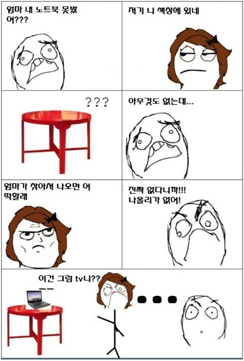 그림에서 아들은 분명히 책상 위에 노트북이 없는 것을 확인했지만 엄마는 노트북을 금방 찾는다.