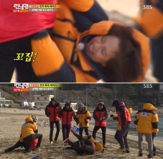 송지효는 이날 자신을 업고 달리는 상대팀 김종국을 방해하기 위해 김종국의 엉덩이를 꼬집는 돌발 행동을 선보였다.