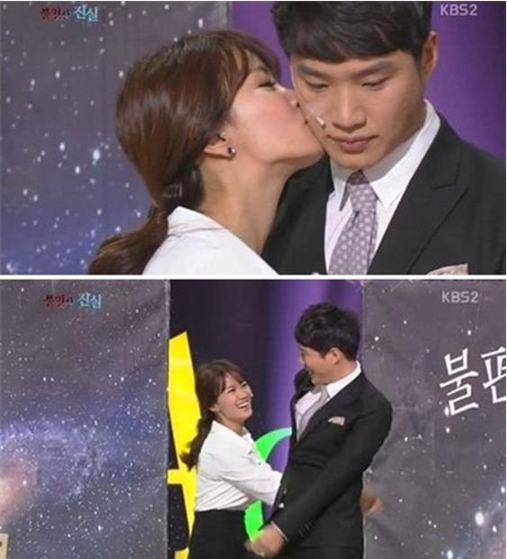 6일 KBS '개그콘서트-불편한 진실'에서 김기리와 김지민은 검사 선후배로 등장해 뽀뽀 장면을 선보였다.