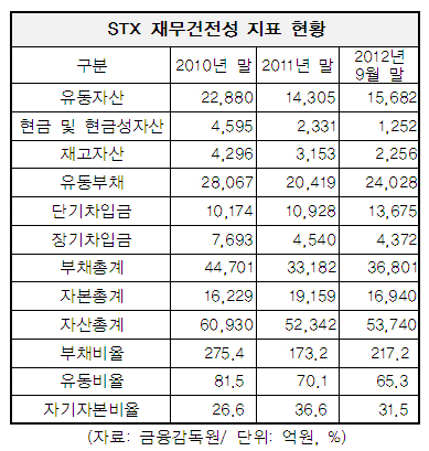 그룹 지주회사인 STX의 경우 지난 2010년 2조2천880억원이던 유동자산이 지난해 9월말 1조5천682억원으로 31.5% 감소했다.