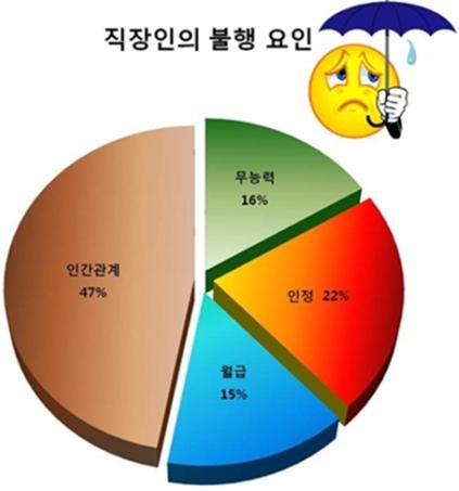 조사결과 직장인 47%가 ‘직장인으로서 불행하게 생각되는 이유’로 직장 내 어려운 인간관계를 이유로 들었다. 이어 ‘열심히 일해도 인정받지 못하는 것(22%)’, ‘업무 능력 부족(16%)’, ‘쥐꼬리 같은 월급이(14%)’으로 조사됐다.