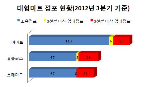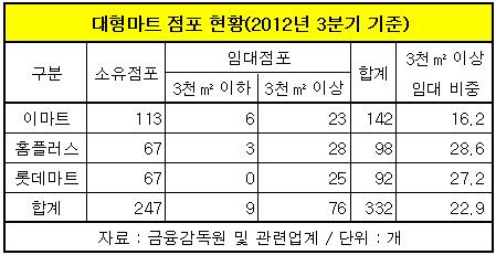 홈플러스의 경우 전체 점포 98개 중 31개가 임대점포이며 이중 28곳은 면적이 3천㎡이상인 대형 점포다. 또 롯데쇼핑은 전체 92개 점포 중 25개가 임대점포이고 이마트는 전체 142개중 29개가 임대점포다.