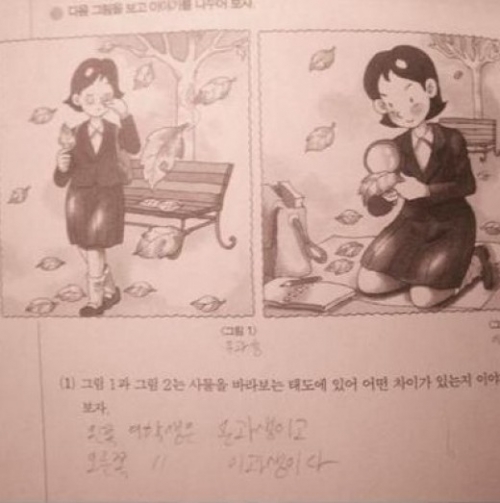 이에 두 그림을 보고 어떤 차이점이 있는지 쓰라는 문제에 ‘왼쪽은 문과 여학생이고, 오른쪽은 이과 여학생이다’라고 답해 보는 이들로 하여금 웃음을 자아냈다.