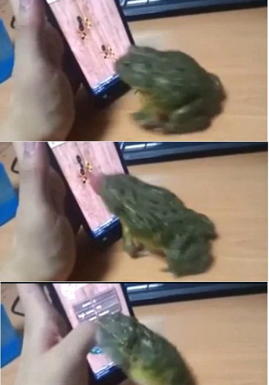 공개된 영상에는 개구리 한 마리를 앞에두고 주인이 휴대전화 화면을 보여주고 있다.