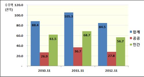 한편 2012년 11월까지 국내건설 수주액 누계는 90조6천962억원으로 전년동기 기록했던 92조1천810억원 대비 1.6% 감소했다.