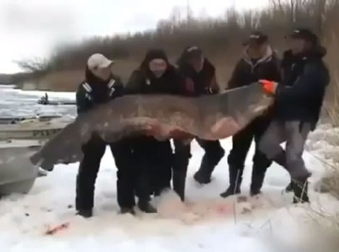 195kg 괴물 메기 동영상은 약 34초 가량 짧지만, 눈으로 뒤덮인 강둑에서 5명의 건장한 남자들이 온 힘을 다해 끌어올리는 장면이 담겨있다.