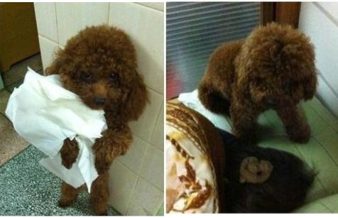 먼저 공개된 사진에는 휴지를 들고 벌을 서고 있는 강아지의 모습이 담겨있다. 두 다리로 선 채 카메라를 바라보고 있는 강아지는 사슴 같은 눈망울로 보는 이들의 애간장을 녹인다.