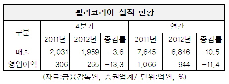 이로써 휠라코리아의 지난해 연간 실적은 매출 6천846억원, 영업이익 944억원으로 전년 보다 각각 10.5%, 11.4% 줄어든 것으로 추산된다.