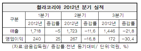 지난해 2분기 매출 1천723억원, 영업이익 267억원으로 각각 11.6%, 16.8% 감소한데 이어 3분기에도 매출 1천446억원, 172억원을 기록해 21.8%, 30.4%나 줄었다.