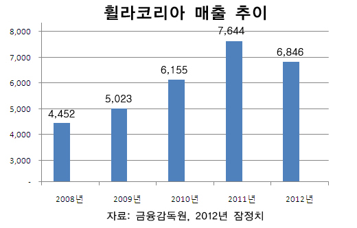 2008년 4천452억원에 불과하던 휠라코리아의 매출은 3년만에 7천644억원으로 71.6%나 늘었다. 매출 증가율은 2009년 12.8%, 2010년 22.5%, 2011년 24.2%를 기록했다.