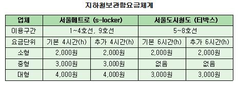 서울메트로가 운영 중인 1~4호선, 9호선 구간의 '새누의 s-locker' 보관함의 경우 요금단위를 4시간 단위로 책정, 보관함의 크기를 소형 중형 대형 3가지로 분류해 각각 2천원, 3천원, 4천원의 요금을 청구하고 있었다.