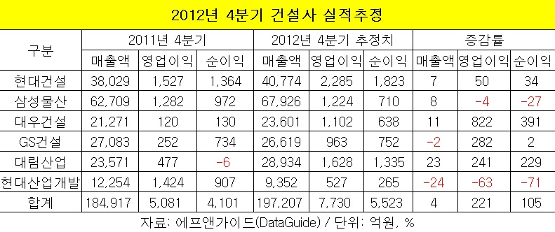 대우건설도 국내 분양시장을 주도한 결과 매출액 2조3천억원, 영업이익 1천178억원으로 추정, 2011년 4분기 대비 각각 12.7%와 885% 폭풍성장했다.