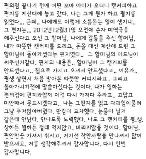 며칠 후 한 꼬마 아이가 편의점으로 찾아와 캔커피와 함께 한 통의 편지를 계산대에 놓고 갔다.