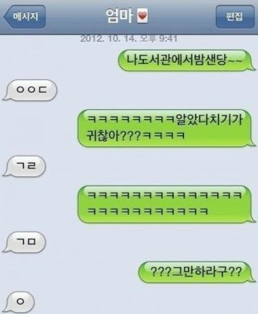공개된 게시물에는 "나 도서관에서 밤샌다"라고 자식이 말하자 엄마는 "ㅇㅇㄷ" 라는 답장을 보낸다.