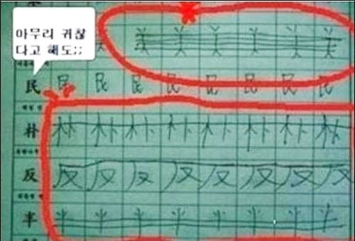 공개된 사진은 한 초등학생의 한자 쓰기노트를 담은 것으로 특히 이학생은 숙제를 빨리 기 위해 가로획이 들어가는 한자를 한번에 그어 완성시켜 보는 이들을 폭소케 하고 있다.