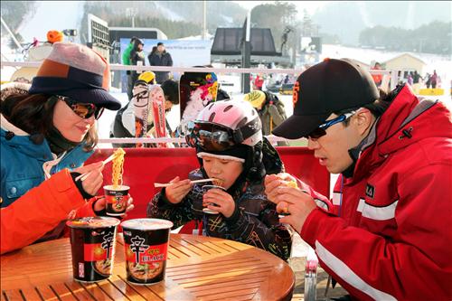 농심 관계자는 “소비자들이 더운 여름보다 찬바람이 부는 겨울철 스키나 보드, 등산 등을 즐기며 야외에서 간편하게 즐길 수 있는 따뜻한 컵라면을 선호하기 때문”이라며 “스키장에서 컵라면으로 한 끼 식사를 해결하는 알뜰 소비자들이 크게 늘었다”고 풀이했다.