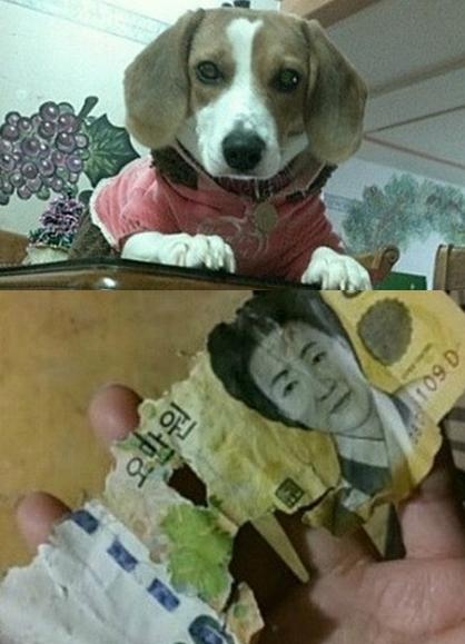하지만 이어진 사진에는 위에 강아지가 물어뜯은 것으로 보이는 5만 원짜리 지폐의 모습이 담겨 있어 보는 이들에게 웃음을 안겼다.