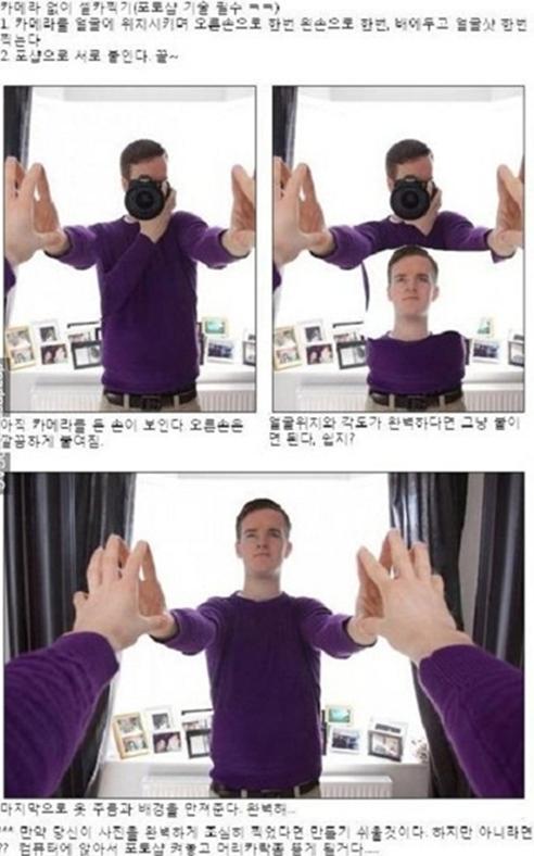 ‘카메라 없이 셀카 찍기’ 사진을 본 누리꾼들은 "카메라 없이 셀카를?", "포토샵만 하면 되는건가?", "어려워 보인다"등의 반응을 보였다. (사진-온라인 커뮤니티)