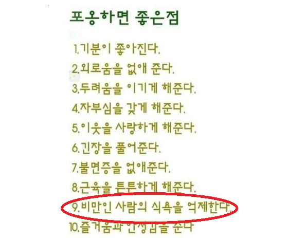 이와 함께 “불면증을 없애준다. 근육을 튼튼하게 해준다. 비만인 사람의 식욕을 억제한다” 등 건강 관련 요인도 포옹하면 좋은 점에 포함돼 눈길을 끌었다.