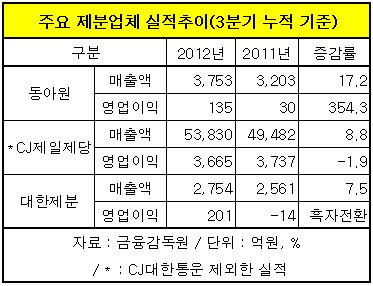 CJ제일제당은 같은 기간에 매출(5조3천830억원)은 8.8% 증가했고 영업이익은 3천665억원으로 전년 동기와 비슷한 수준을 유지했다.