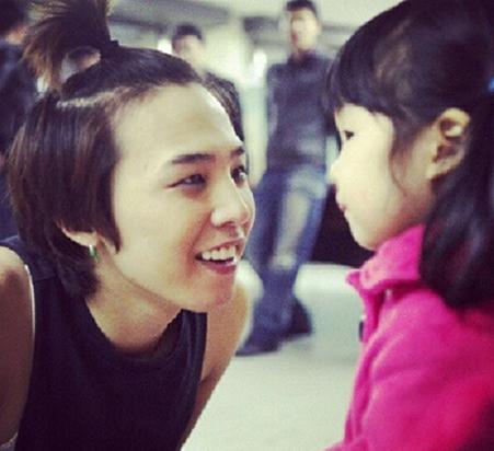 사진에서 사과머리를 한 지드래곤은 양갈래 머리로 귀여움을 뽐내는 하음 양에게 눈맞춤을 시도했다.