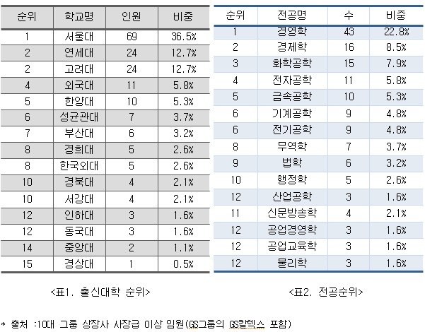 이 중 서울대는 10명중 3.7명으로 가장 많았으며 GS그룹을 제외한 9개 그룹 사장 이상 임원의 최다 출신학교도 서울대로 나타났다.