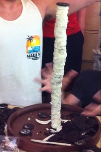 사진 게시자는 "화이트 크림이 들어 있는 샌드위치형 쿠키를 듬뿍 샀다. 먹으려고 산 것은 아니다. 즐거움을 위해 돈을 썼다. 친구들과 모여 과자를 조심스럽게 하나하나 분리하고 붙였다. 곧 쿠키 하얀 거탑이 쌓아올려졌다. 우리는 박수를 치고 행복을 맛봤다"라고 전했다.