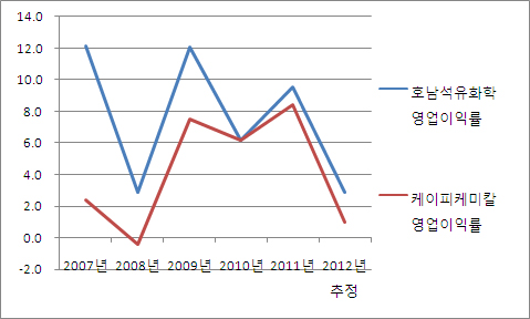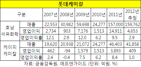 18일 에프앤가이드에 따르면 지난해 호남석유화학은 매출 15조9천762억원으로 2011년보다 2% 늘었지만 영업이익은 4천653억원으로 69%나 감소할 것으로 전망됐다. 영업이익률도 2.9%로 지난 5년이래 최악을 기록할 전망이다.