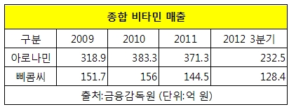 현재 아로나민 시리즈는 전체 종합비타민 시장에서 약 35%의 점유율을, 삐콤씨는 15%를 차지한다. 두 제품이 전체 종합비타민 시장의 절반을 차지하고 있는 셈이다.