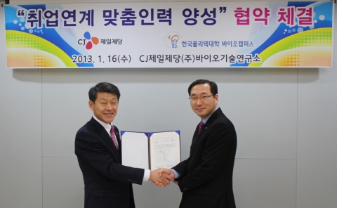 CJ제일제당과 한국폴리텍대학 바이오캠퍼스는 지난 16일 강서구 가양동 CJ제일제당 BIO기술연구소에서 전문 바이오 기술인력을 양성하기 위한 ‘취업연계 맞춤인력 양성’ 협약을 체결했다고 17일 밝혔다.