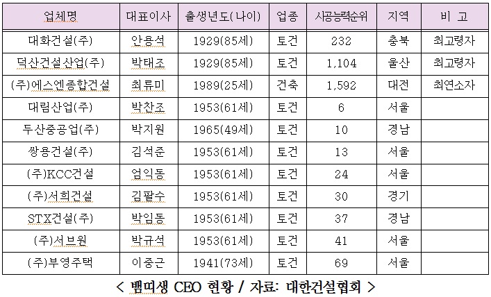 100위권 내에는 14개사의 CEO가 이름을 올렸는데, 올해 환갑(61세)을 맞이한 CEO들이 많았다. 김석준 쌍용건설 회장과 엄익동 KCC건설 대표, 김팔수 서희건설 대표, 박임동 STX건설 대표 등이 대표적이다.