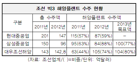 지난해 해양플랜트 비중이 전체 수주액의 88%를 차지한 삼성중공업은 올해 130억달러 수주 목표 가운데 100억달러를 해양플랜트에서 거둘 것으로 보고 있다.