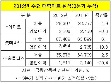 지난해 3분기 영업이익이 전년 동기 대비 6.6% 감소한 이마트나 10.3% 감소한 롯데마트에 비해서도 수익성 악화가 두드러진다.