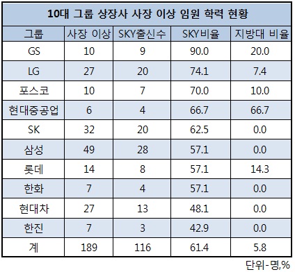 국내 10대 그룹 중 상장 계열사 사장 이상 임원의 스카이(SKY)대학 출신 비중이 가장 높은 곳은 GS이고 가장 낮은 곳은 한진과 현대자동차였다.