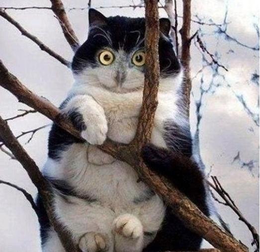 공개된 사진에는 고양이 한 마리가 마치 부엉이 같은 눈을 하고 나뭇가지에 매달려있다.