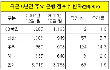 국내에서 가장 많은 점포를 보유한 KB국민은행은 20007년 말 1천205개였던 점포수가 지난해말 1천193개소로 12곳 감소했다.
