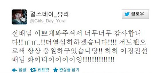 앞서 이정진은 18일 방송된 MBC 섹션TV 연예통신에서 "요즘 걸스데이 중 특히 유라가 이쁘다"며 "시원시원한 외모와 예쁘게 웃는 모습이 좋다"고 밝힌 바 있다.(사진-유라 트위터)