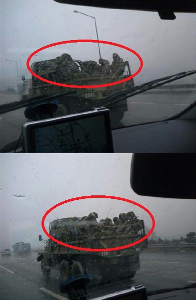 그런데 비가 많이 오는 중임에도 불구하고 군용 트럭에는 방수포가 없어 군인들이 비를 맞고 있었다.