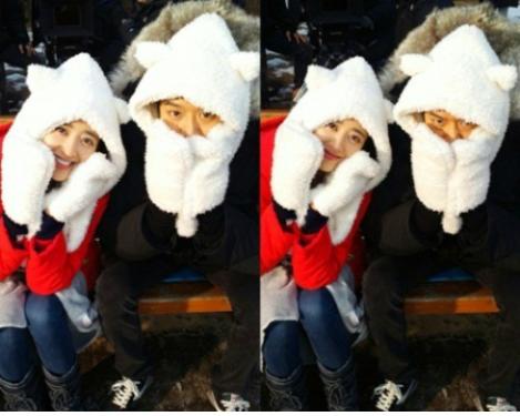 사진 속 두 사람은 모자가 달려있는 흰색 커플 목도리를 해 마치 연인같은 모습.