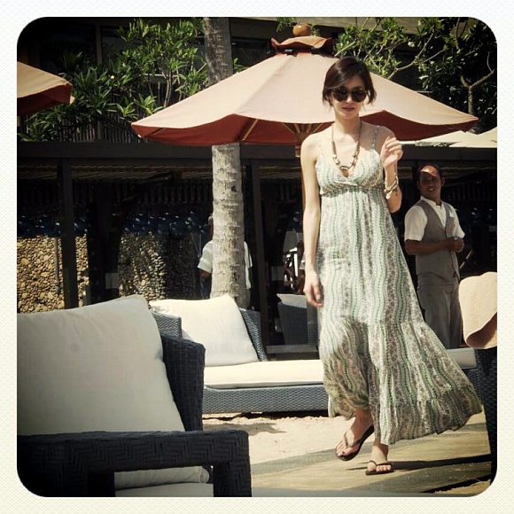 사진에는 윤혜진은 인도네시아 발리의 한 리조트에서 화려한 패턴의 비치 드레스를 입고 발레리나다운 우아한 자태로 걷고 있는 모습이 담겨 있다.