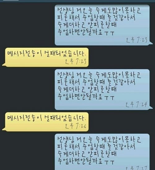 이어 과외선생의 답장은 "메시지 전송이 실패되었습니다"라고 왔다. 이를 본 학생은 다시 전에 보낸 문자를 똑같이 보냈고, 과외선생의 답장도 같은 답장이 계속돼 웃음을 자아냈다.