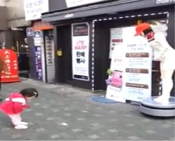 공개된 영상에는 한 아기가 휴대전화 매장 앞에 설치된 인사하는 인형 앞에서 인사를 하고 있다.